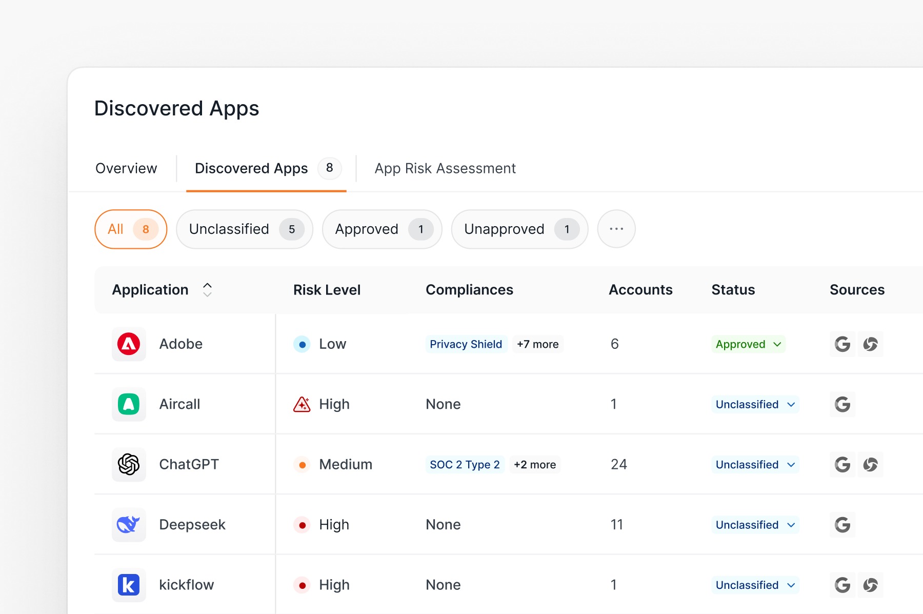 Regular automated scans ensure the SaaS inventory remains up to date as employees adopt new tools. This real-time visibility forms the foundation for effective security posture management across the SaaS ecosystem.