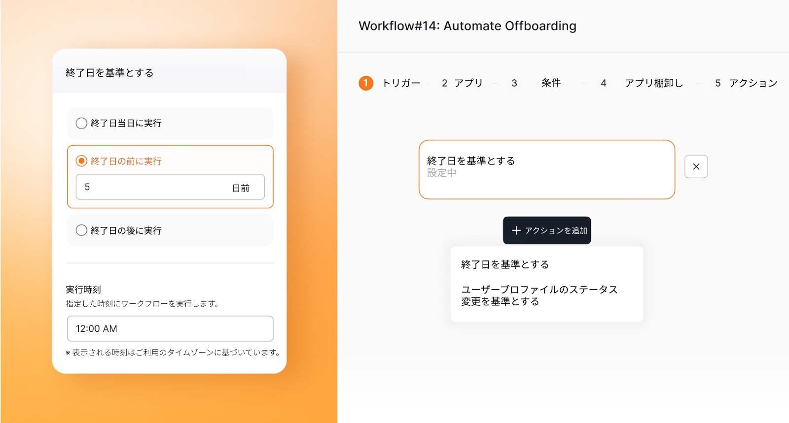 管理者は、入社・退職ワークフローを主要日付の前・当日・後日のいずれかで実行するよう設定し、実行時刻を指定することが可能になりました。最終利用状況に基づくライセンス最適化の自動化にも対応しています。