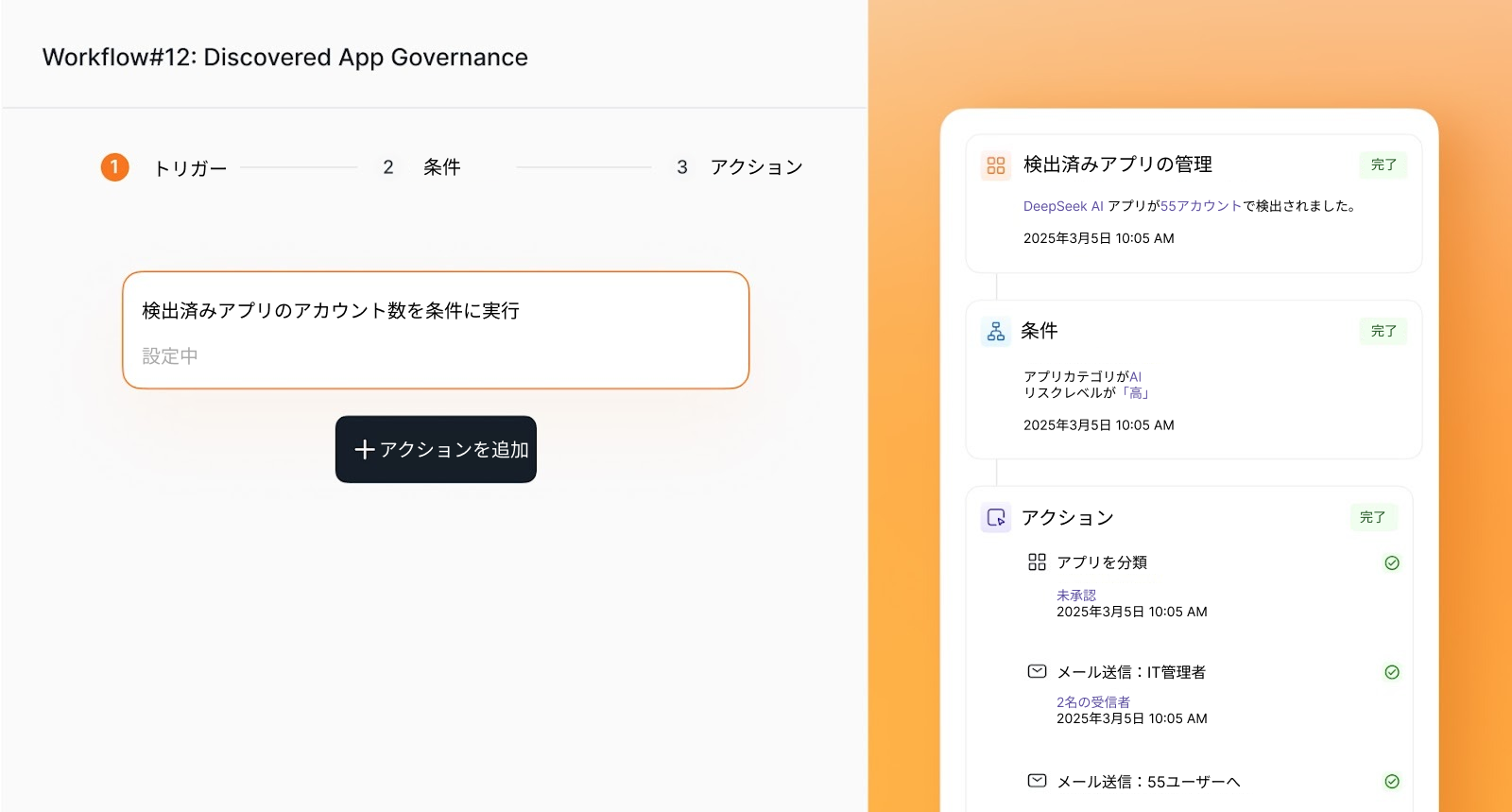 未承認アプリへの迅速な対応・一貫したポリシー適用・IT担当者の手動対応の大幅削減が実現します。