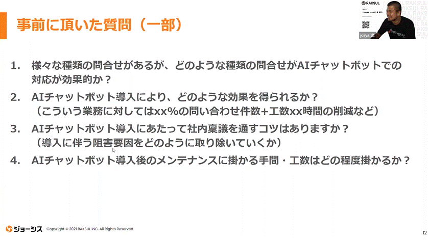 中村さん:先ほどご紹介した200名規模で700万円の削減は人件費の1人~2人分になるため、人を1人増やすよりも、チャットボット入れて働かせたほうが安くなります。