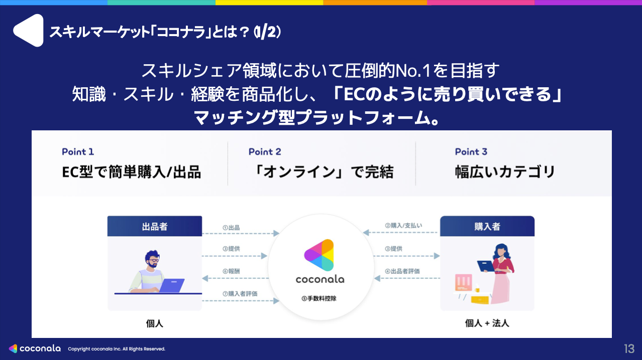 川崎さん:まずは簡単にココナラの紹介をさせてください。ココナラは、知識・スキル・経験を商品化して「ECのように売買できる」マッチングプラットフォームです。ココナラと聞くと、プライベートシーンで利用されるサービスというイメージを持たれる方も多いのですが、2021年からはビジネスシーンに特化した「ココナラBusiness」をローンチしたことで、近年では法人向けの出品も増えています。