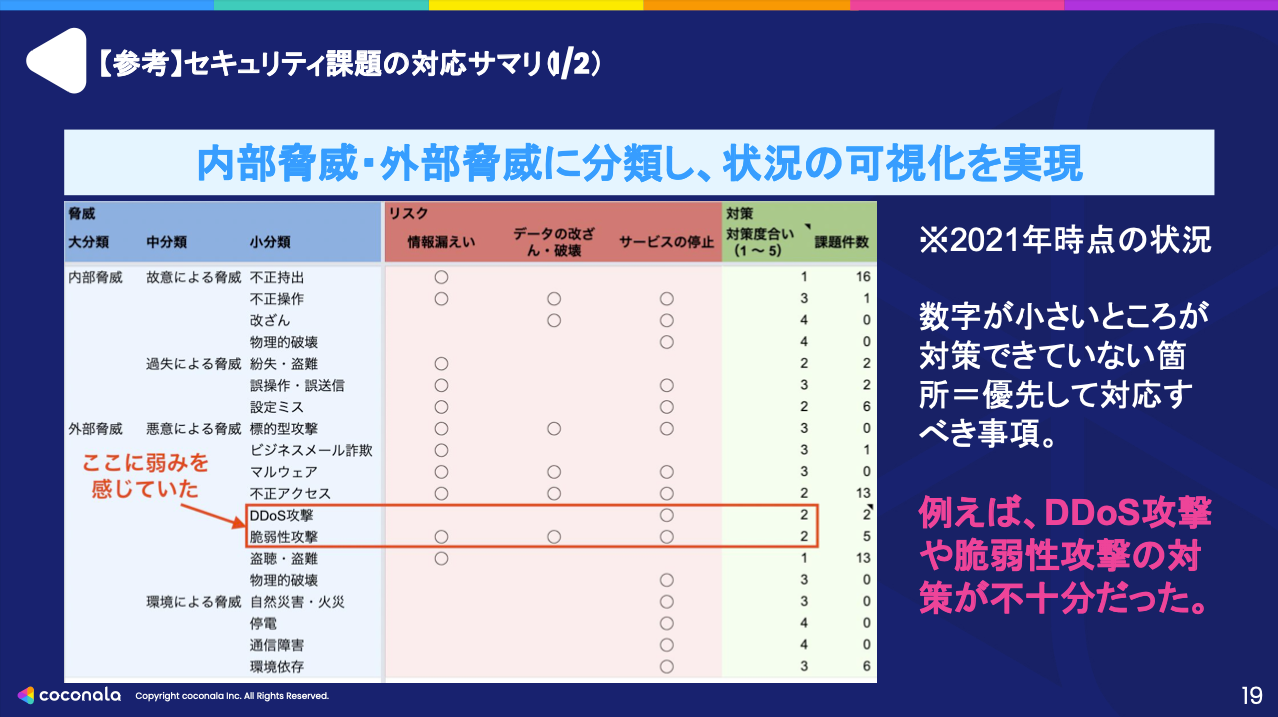 川崎さん:いくつかの課題があった状況のなかで、自分たちが手始めに何をやったかというと、セキュリティ上の脅威を「内部脅威」と「外部脅威」に分類し、対応状況を可視化しました。その上で、分類した各項目の対策度合いに5段階評価をつけ、数字の低い(=対策度合いが低い)箇所を優先的に対策を講じていきました。