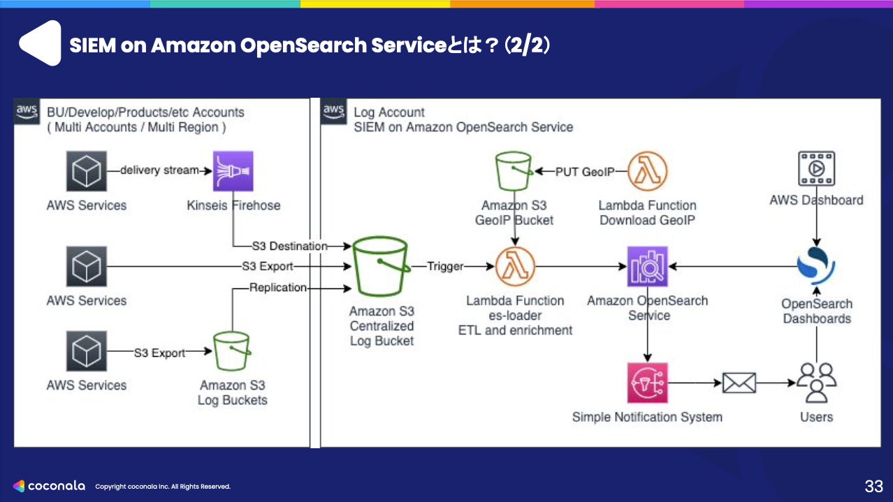 川崎さん:セキュリティ分析を効率的に進めるためには、統合的にモニタリングできる仕組みが必要であることから、ココナラでは「SIEM on Amazon OpenSearch Service」を導入しました。