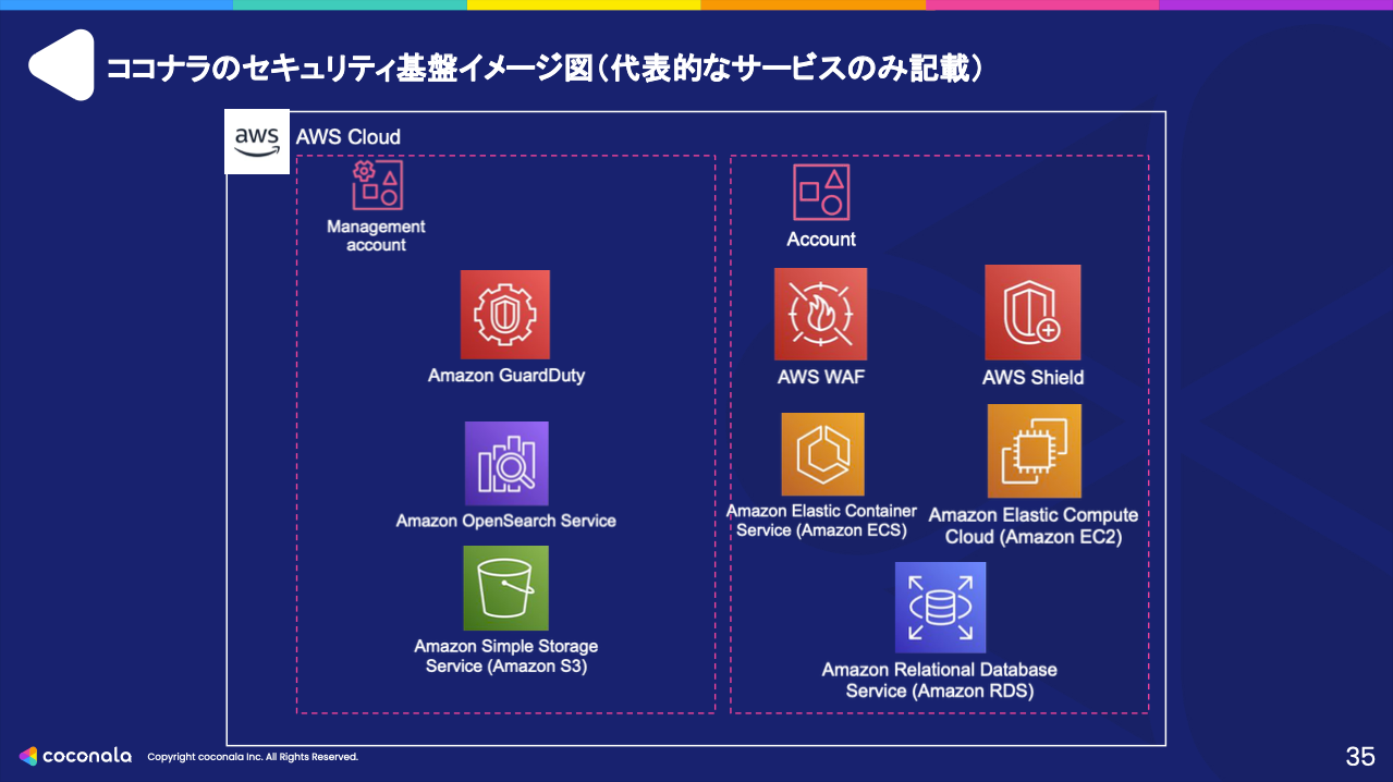 川崎さん:ココナラのセキュリティ基盤のイメージを簡単に紹介させていただきます。ココナラではAWSのベストプラクティスに従い、プロダクトが稼働するアカウントとセキュリティが司るアカウントに分けて運用しています。