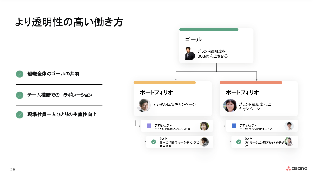 このように、Asanaを通じて透明性の高い働き方を実現することで、全社横断でのコラボレーションが生まれたり、現場社員一人ひとりの生産性向上につながったりしています。こうしたことからもAsanaは、「全社を見える化するワークマネジメントツール」というコンセプトを大切にしています。