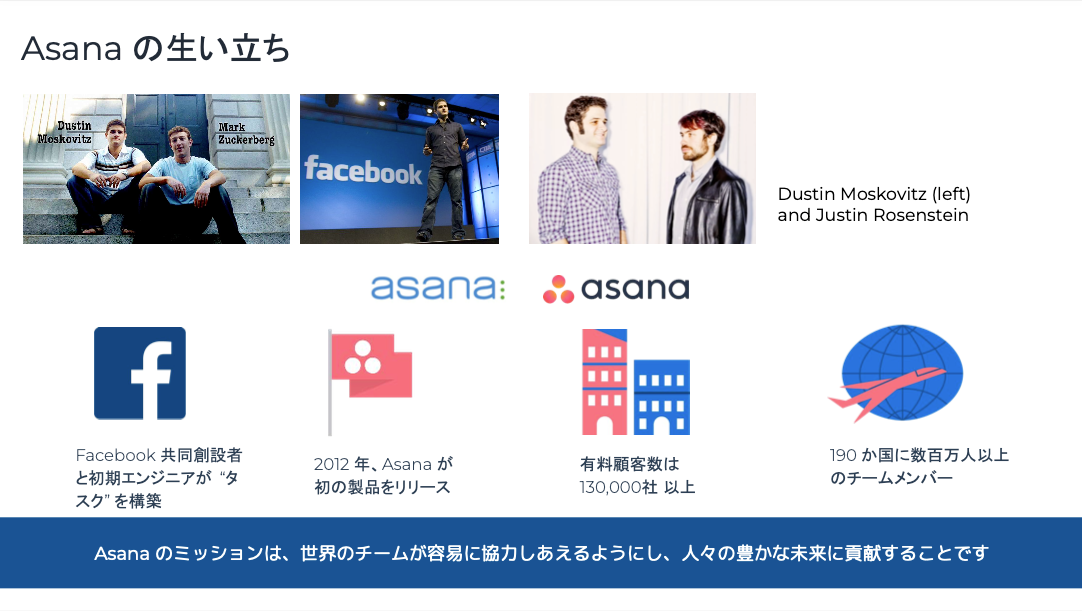 その時の成果をもとにダスティンはFacebookを退職し、Asanaを立ち上げたという経緯です。現在Asanaは世界190ヵ国で13万社以上の有料顧客を抱えるまでに成長しました。2019年に日本法人(Asana Japan)を立ち上げ、現在マーケットの拡大を進めている最中です。