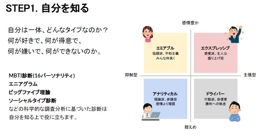 小林さん:アナリティカルタイプであれば、エクスプレッシブタイプとは言語が合わないし、エミアブルタイプは、ドライバータイプとは合わないんですよ。隣同士は案外近いので、言語が違っても話が通じる場合もあります。