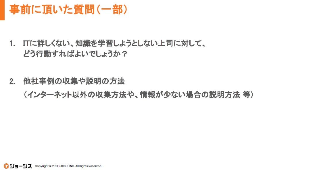 ―― 「情報が少ない場合の他社事例の収集や説明方法、インターネット以外での情報収集する方法を教えてください」という質問もいただきました。