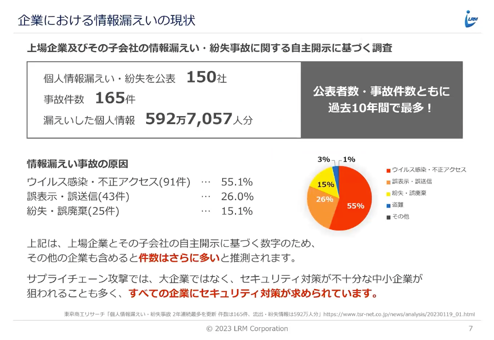 セミナー前半ではLRM株式会社の正田さんより、「情報漏えい事故の原因と対策」「セキュリティ教育を行う際のポイント」について解説いただきました。