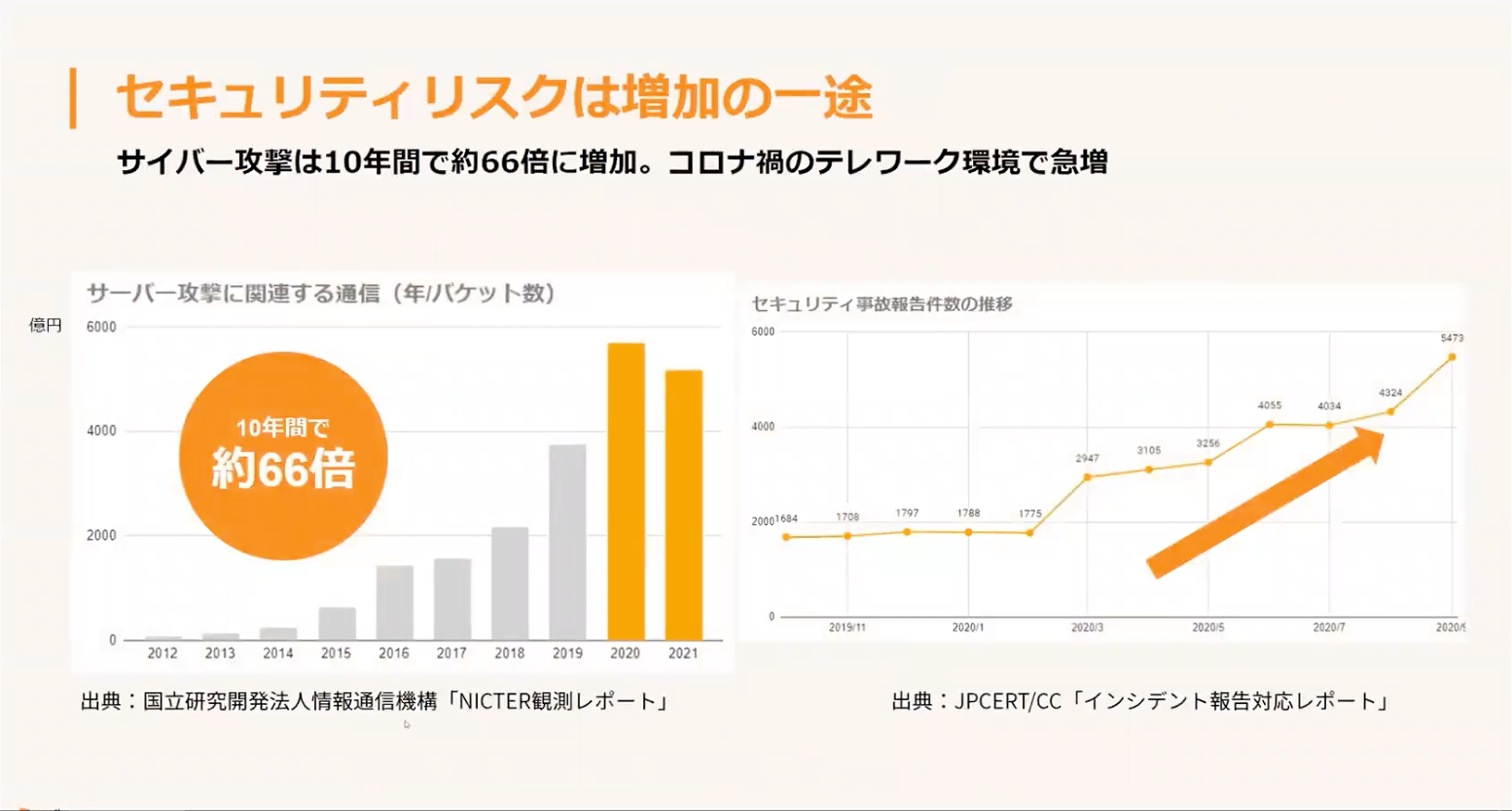 これらの課題が顕在化したことで、企業のセキュリティリスクも増加の一途をたどっています。サイバー攻撃に関連する通信は直近10年間で約66倍に増加し、それに比例してセキュリティ事故報告件数も急増しています。