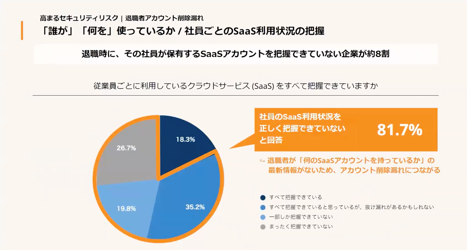 しかしながら、「社員ごとのSaaS利用状況を正しく把握しているか」という質問に対して、約8割の企業が「正しく把握できていない」と回答しています。その結果、退職者のアカウント削除漏れにつながり、情報漏えいリスクが高まる要因となっています。