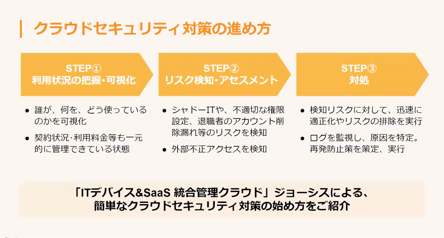 後半パートでは、ジョーシス株式会社の重森より、効果的なSaaS管理方法というテーマで、具体的なセキュリティ管理のステップを解説いただきました。