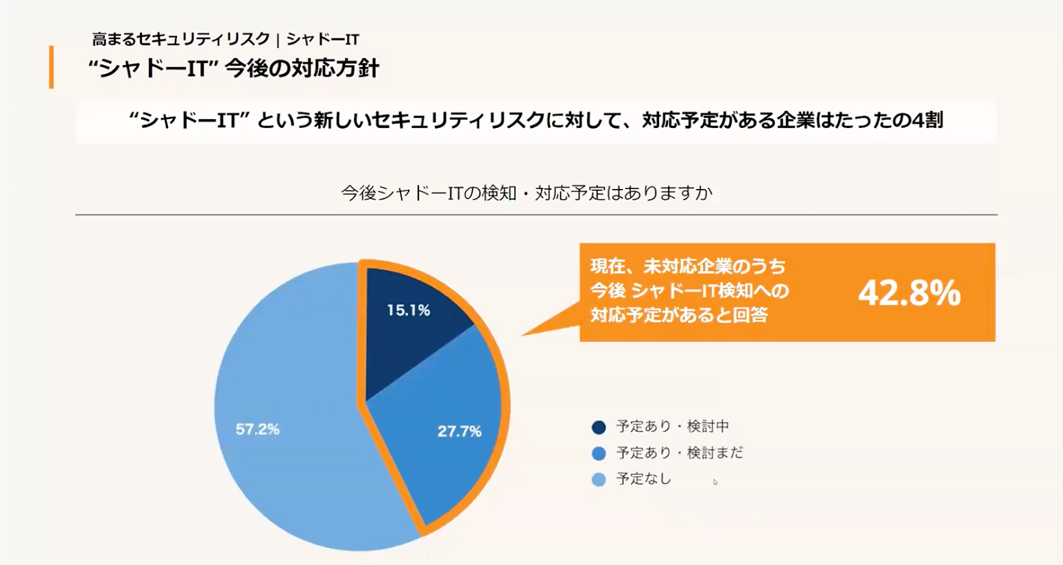 実際、シャドーITのリスクに気付いていながら、ほとんどの企業がどのように対処したら良いかわからず、手つかずの状態になっているというのが現状です。さらに、こうしたセキュリティリスクに対して、シャドーIT検知の対応を予定している企業はわずか4割程度にとどまっており、情報セキュリティ対策に対する意識の低さがあらわれています。