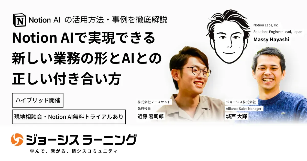 今回のジョーシスラーニングのテーマは「Notion AIで実現できる新しい業務の形とAIとの正しい付き合い方」。Notion公式アンバサダーとしてご活躍される近藤容司郎さんと、Notionのソリューションエンジニアの林優さんをゲストに迎え、Notio AIの特徴から実践的な活用方法まで解説いただきます。
