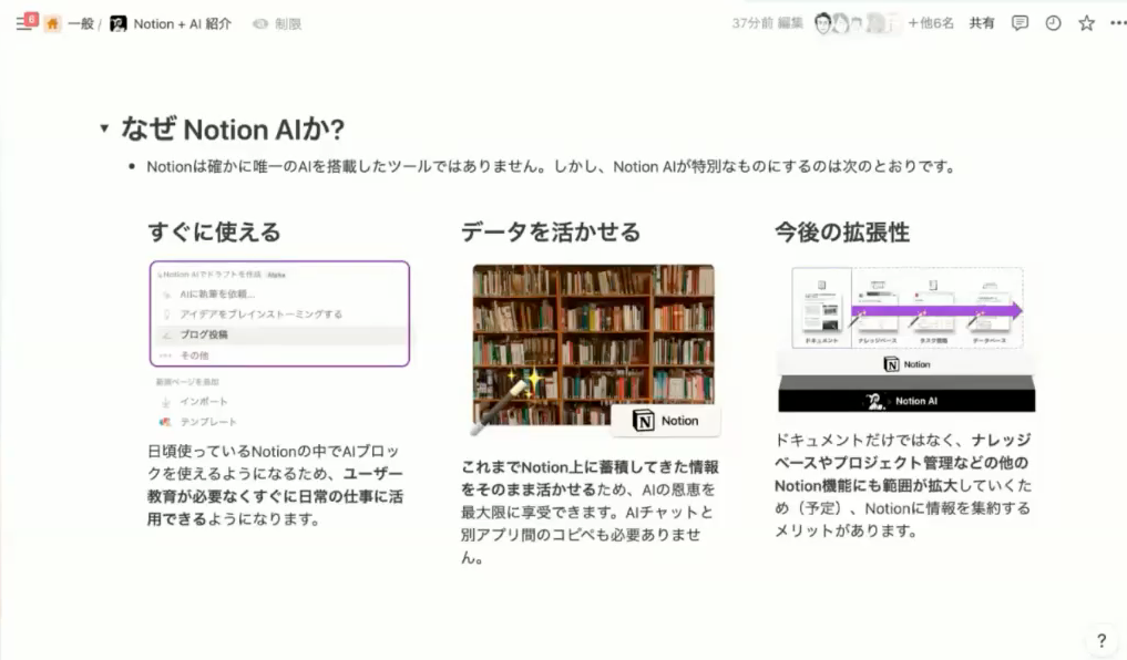 またNotion AIでは、AIモデルのトレーニングにお客様のデータを使用することは一切ありません。あくまでも、Notion AI機能を提供するためだけに利用されますので、安心して使っていただけたらと思います。