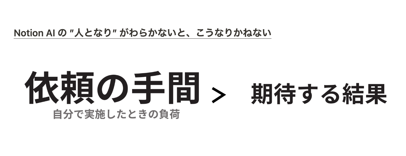 要は人に何かを依頼する際に、あるべき方程式としては、「依頼の手間」よりも「期待する効果」が上回っている状態が理想です。しかしながら、Notion AIがどういうものかわかっていないと、依頼の手間のほうが大きくなりかねません。