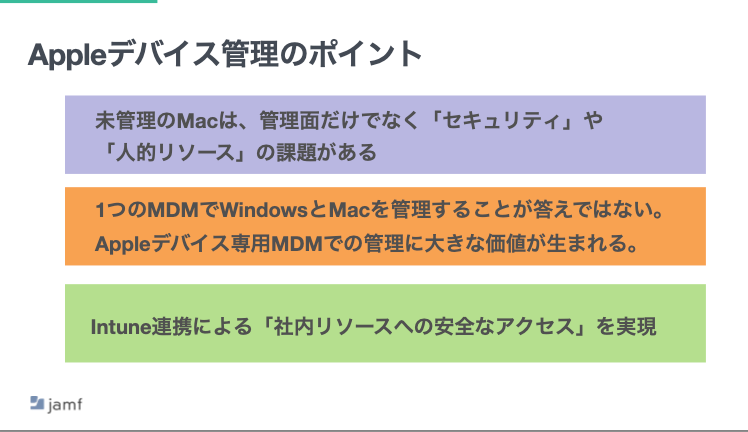 1つ目は、未管理のMacは管理面だけではなくて「セキュリティ」や「人的リソース」に課題があると認識すること。2つ目は、1つのMDMでWindowsとMacを管理するということは一見スマートに見えますが、それは答えではないということです。つまりAppleデバイス専用MDMで管理をすることに価値があります。3つ目は、Intune連携によって社内リソースへの安全なアクセスを実現することです。