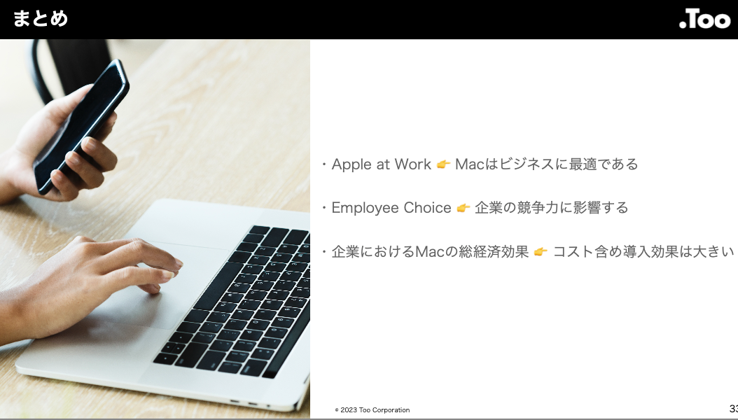 今はビジネスにおいて、MacをはじめとしたApple製品の活用は重要な戦略となっています。またITコストに関するメリットや従業員エンゲージメントへの影響も大きいため、管理できないから使わないという選択をするのではなく、どうやって導入するかを前提にしたうえで、導入の選択肢を増やしていただけたらと思います。