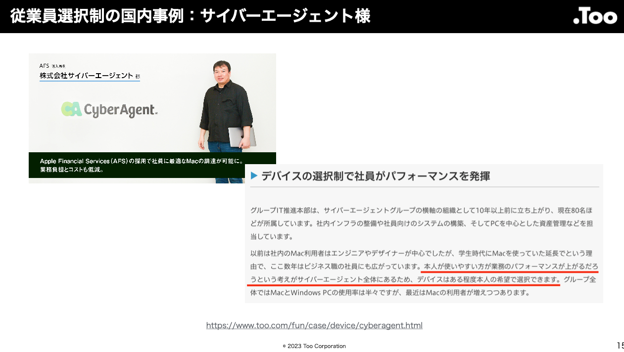 2つ目の事例はサイバーエージェント様です。元々はエンジニアやデザイナーなどに限定してMacを利用されていたのですが、近年では「学生時代にMacを使っていました」という方も増え、その流れで営業部門やマーケティング部門でもMacを使いたいというニーズが出てきたそうです。