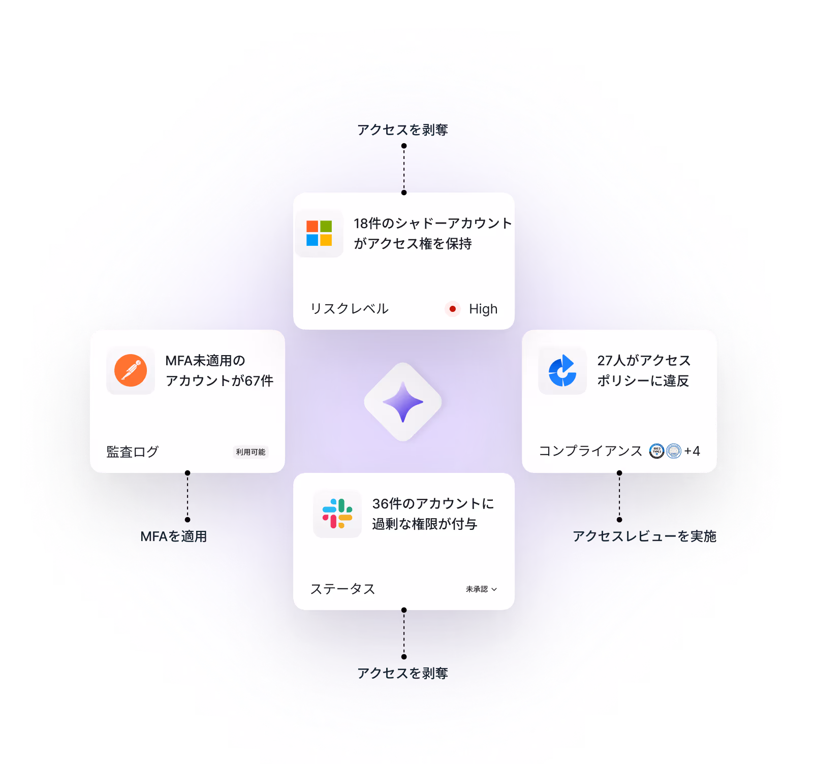 利用状況に基づいて権限を調整し、アプリ棚卸しを実行することで、アクセス権限を自動的に最適化します。