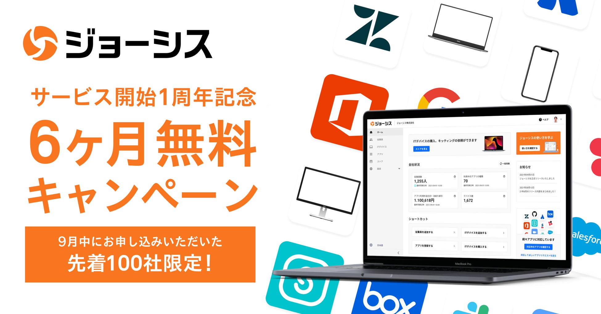 サービス開始1周年を記念し、先着100社限定で6ヶ月間無料でジョーシスをご利用いただける特別キャンペーンを実施しています。