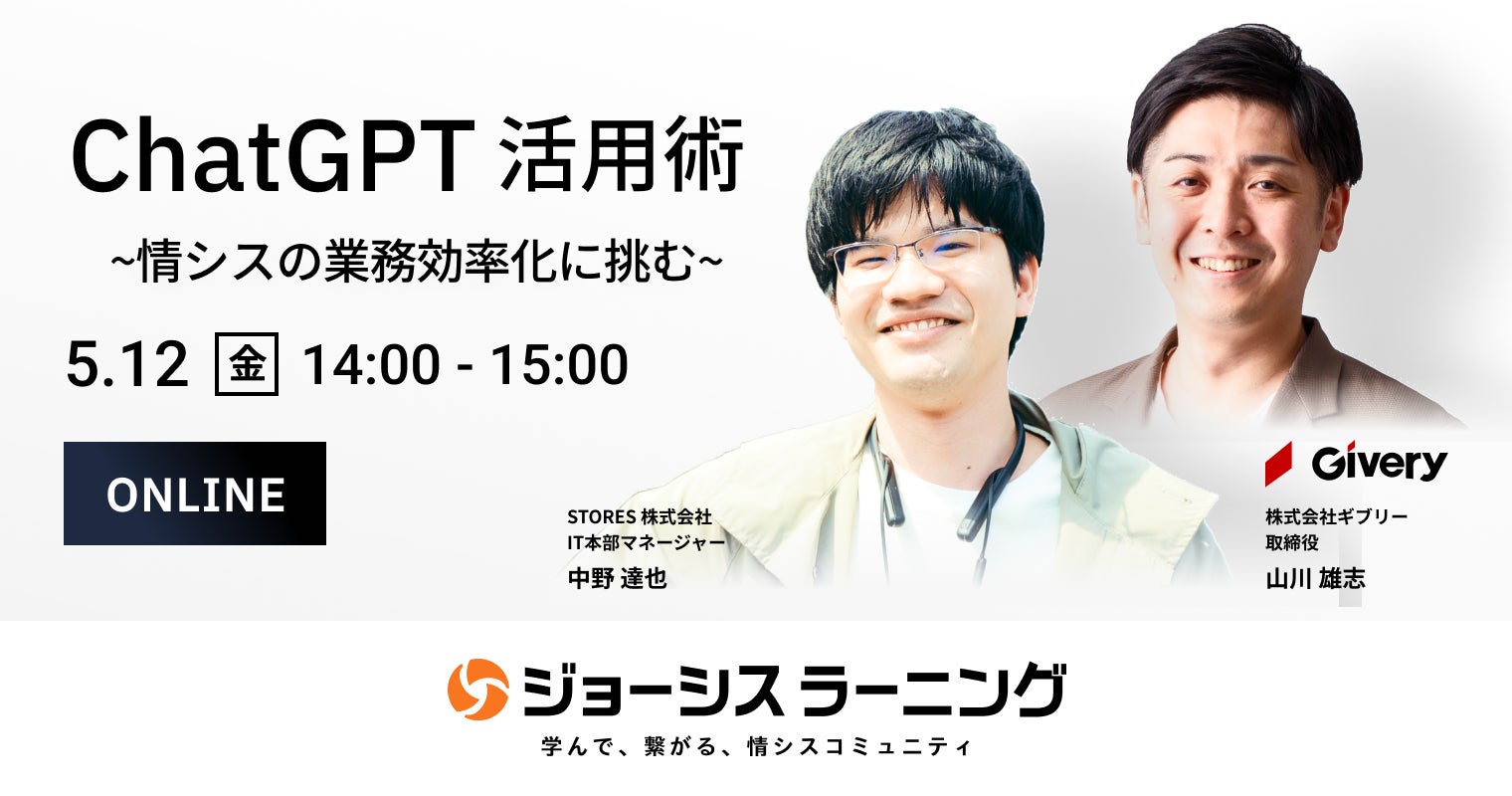 本セミナーでは、ChatGPTの活用ノウハウ、情シスの実務面でも活⽤できる術を株式会社ギブリーさま・STORES 株式会社さまを交えて徹底解説します。ここでしか聞けない「ChatGPT×情シス」の特別セミナーとなっておりますので、ぜひご参加ください。