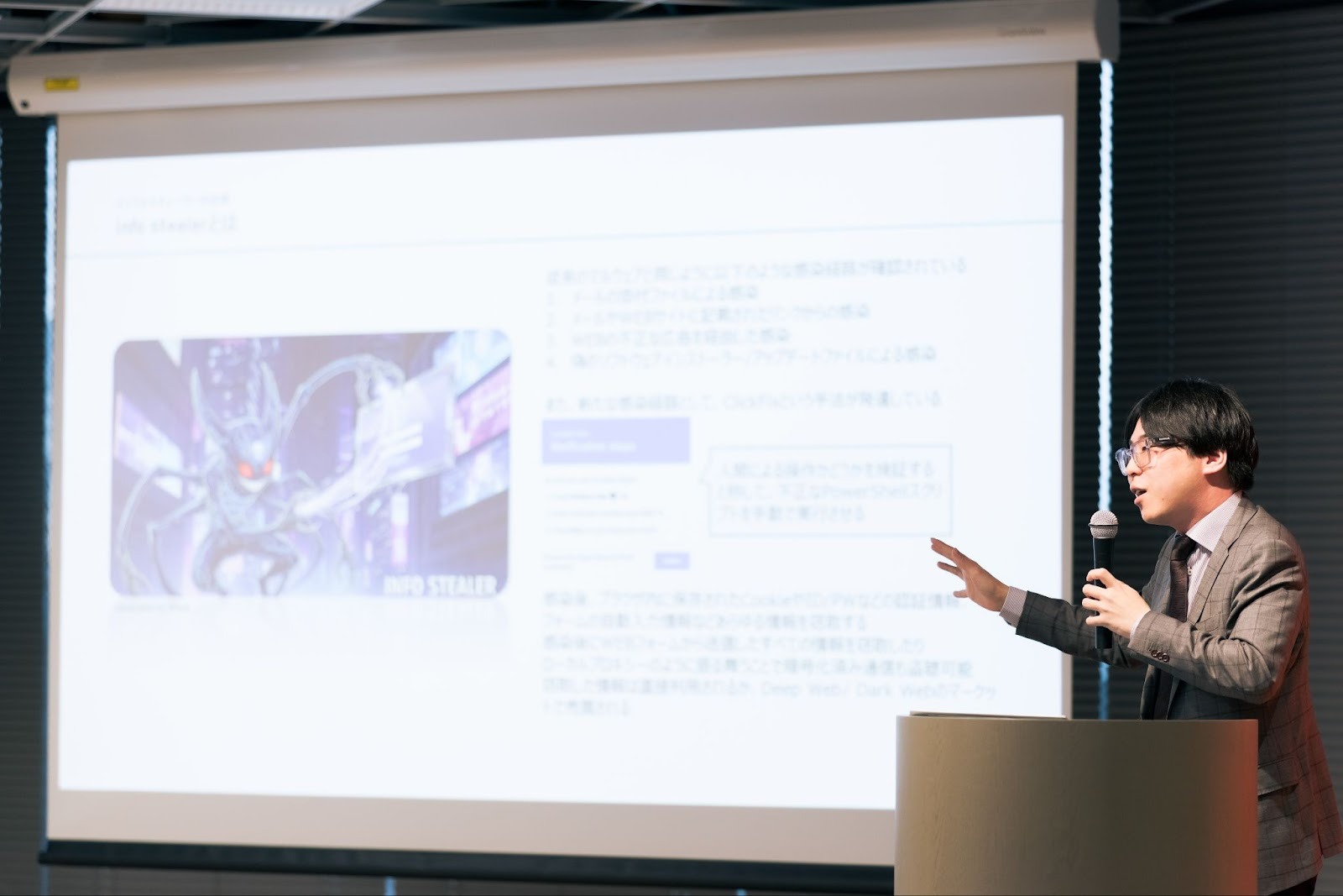基調講演には、サイバーセキュリティの第一人者である西尾素己氏が登壇。昨今被害が拡大している「インフォスティーラー型攻撃」について、日本国内での感染実態や、認証情報が闇市場で売買されるメカニズムを解説いただきました。