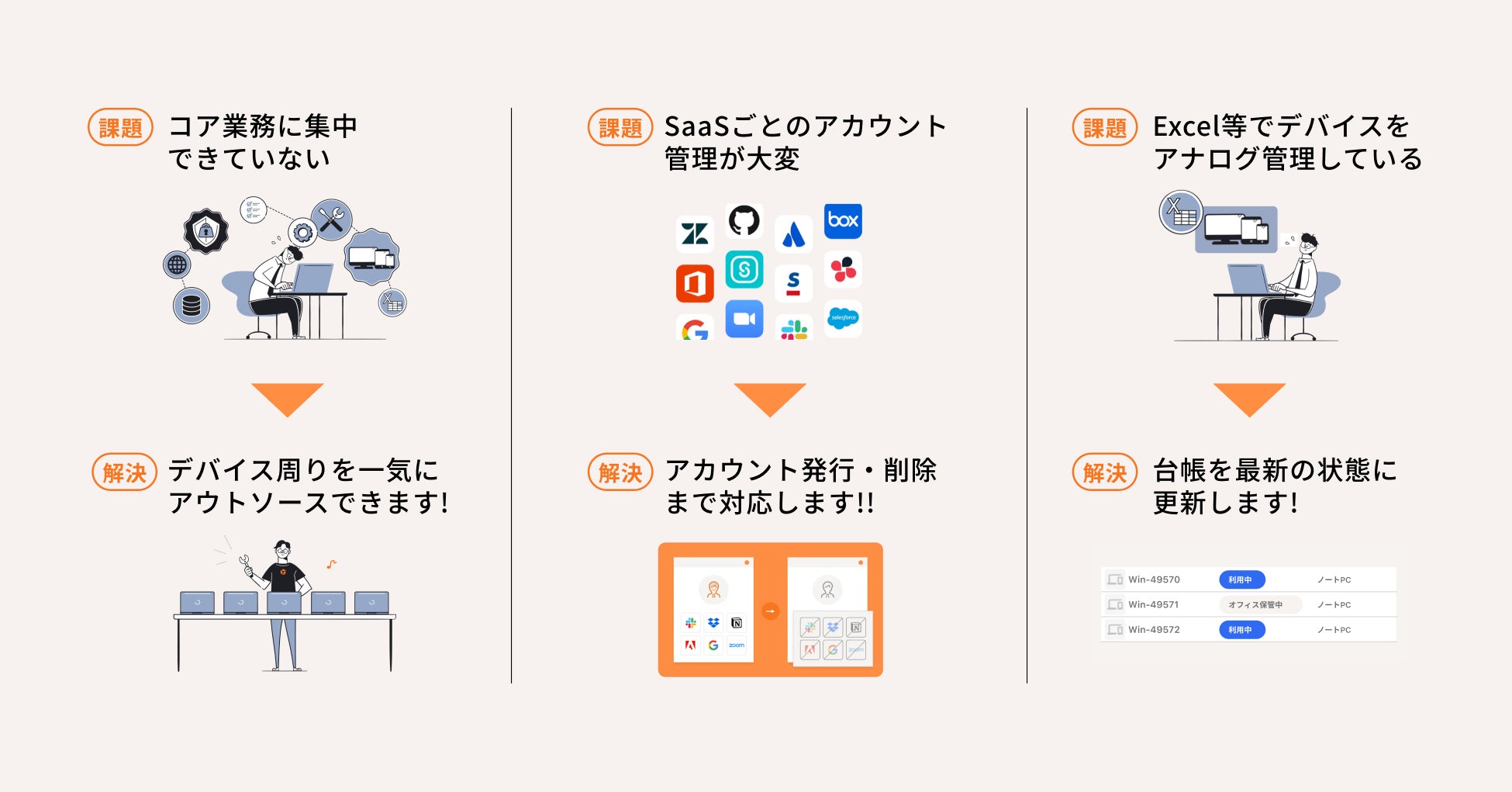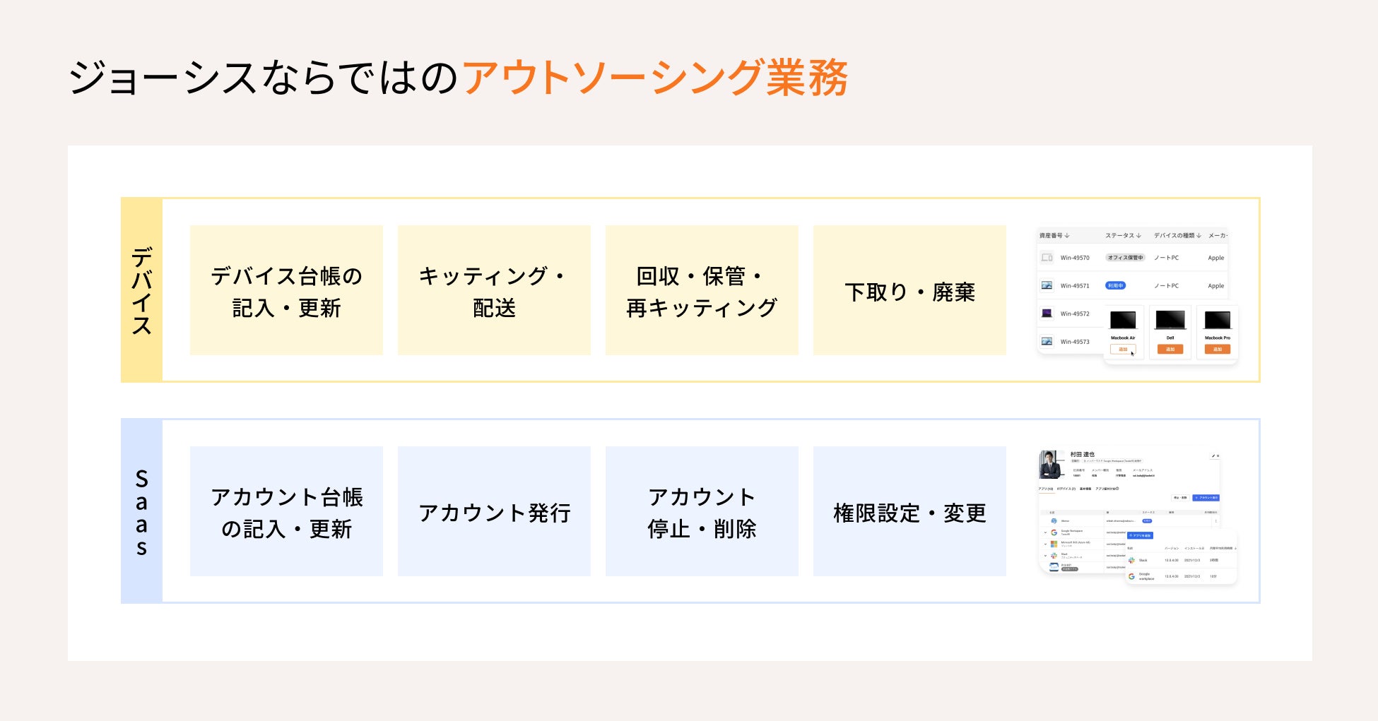 台帳管理やキッティングなどのデバイス業務だけではなく、アカウント発行、削除などSaaSについて発生する様々な管理業務を全て対応します。