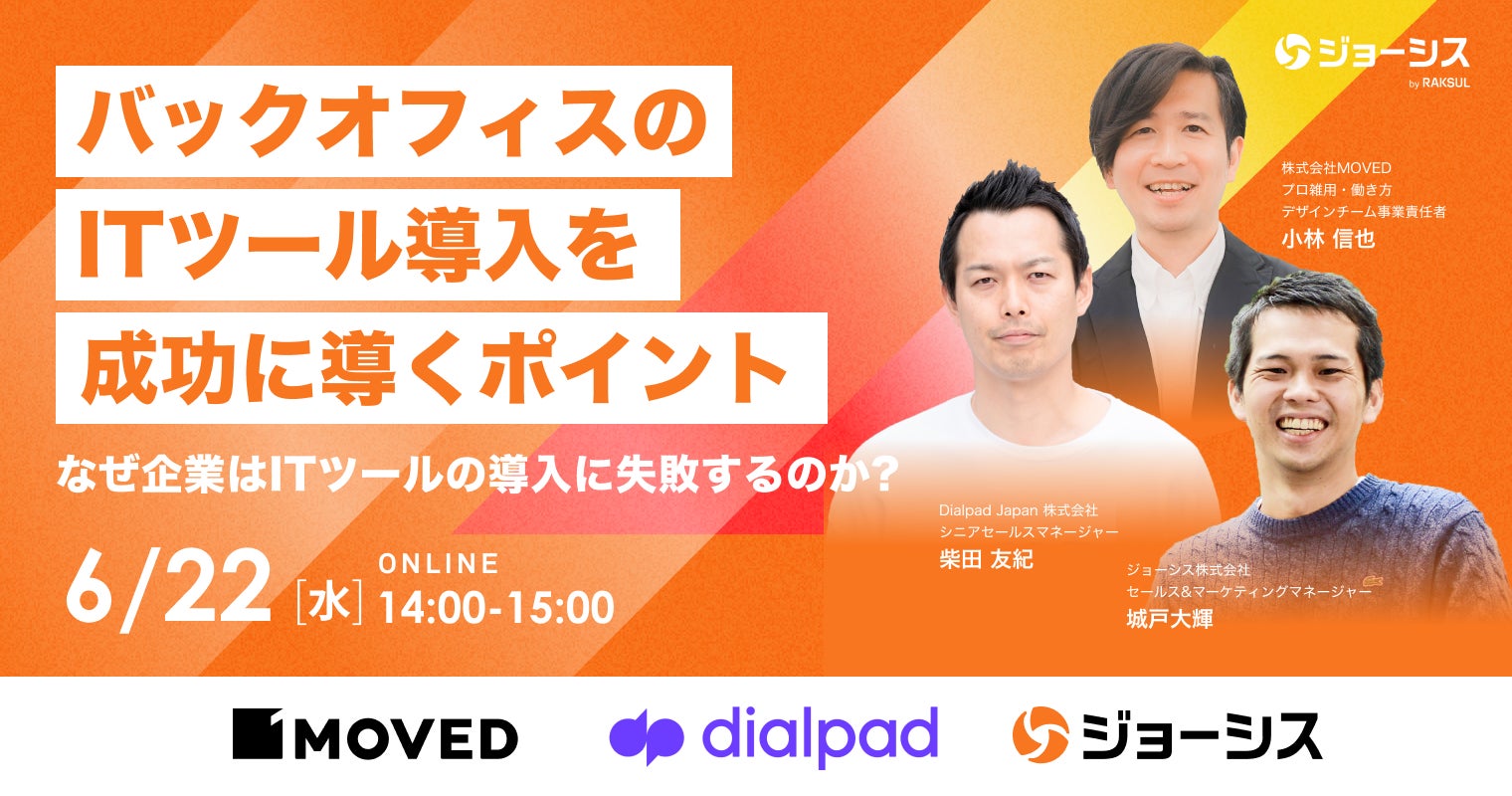 ITデバイスやSaaS管理などのコーポレートIT業務を自動化・アウトソース可能とするプラットフォームを運営する、ラクスルグループのジョーシス株式会社(本社:東京都品川区、代表取締役社長CEO:松本恭攝)は、ジョーシス × Dialpad × MOVEDの3社共催セミナー「バックオフィスのITツール導入を成功に導くポイント ~なぜ企業はITツールの導入に失敗するのか?~」を開催することをお知らせいたします。