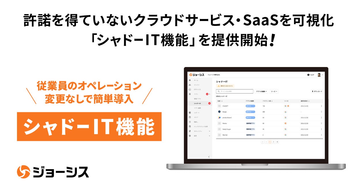 情報システム部門におけるITデバイスやSaaS管理などのノンコア業務を効率化するプラットフォームを運営する、ラクスルグループのジョーシス株式会社(本社:東京都品川区、代表取締役社長CEO:松本恭攝、以下「当社」)は、情報システム部門や経営層などが利用状況を把握しきれていないWEBサービスやSaaSを自動的に検知する「シャドーIT機能」をリリースしたことをお知らせいたします。(URL:https://jp.josys.com/)