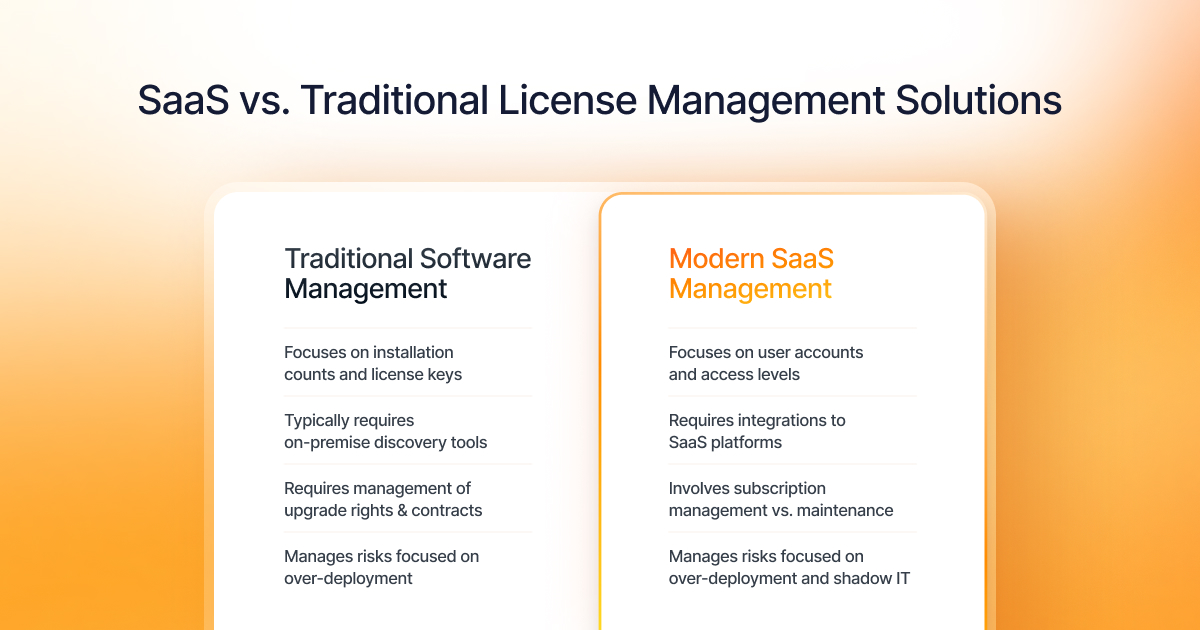 The shift from on-premises software to SaaS applications has fundamentally changed license management requirements. Understanding these differences is essential for selecting the right approach for your environment.