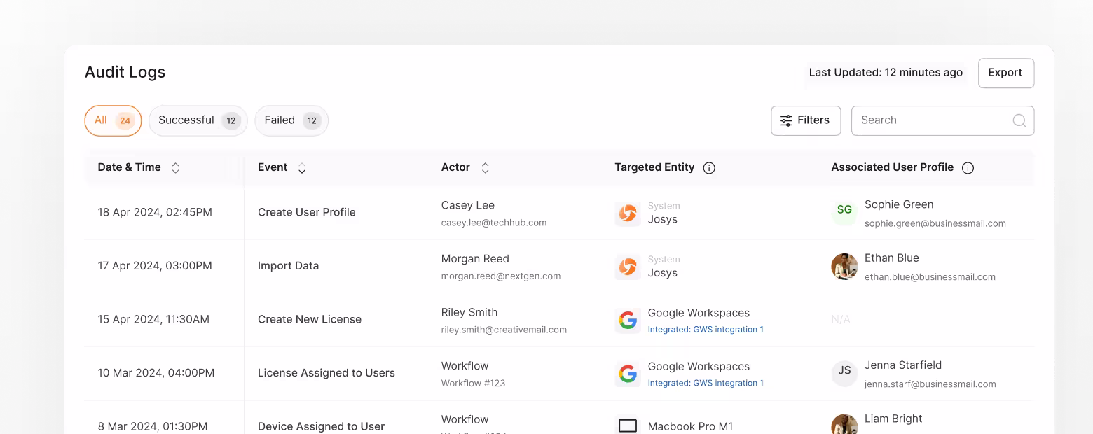 Get a granular view of all recent app activity, easily filtered by license type, roles, and permissions.