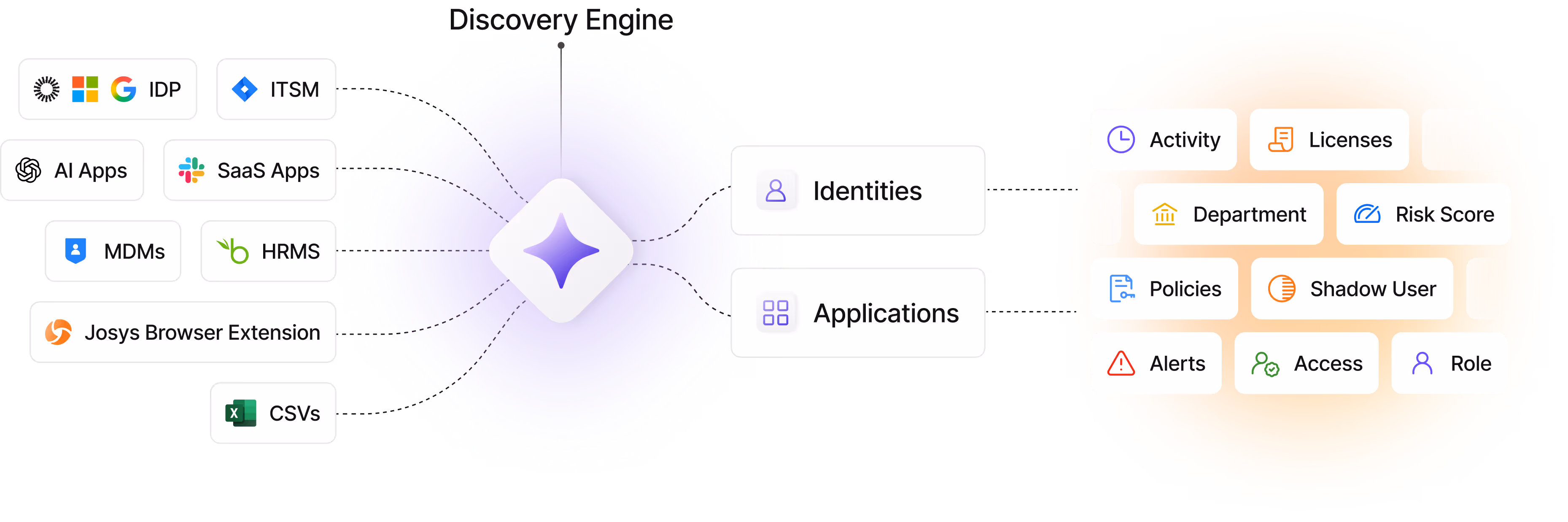 Josys discovers all your identities and SaaS apps from multiple sources, then brings deeper visibility into user lifecycles, least-privilege access, and shadow IT for stronger governance