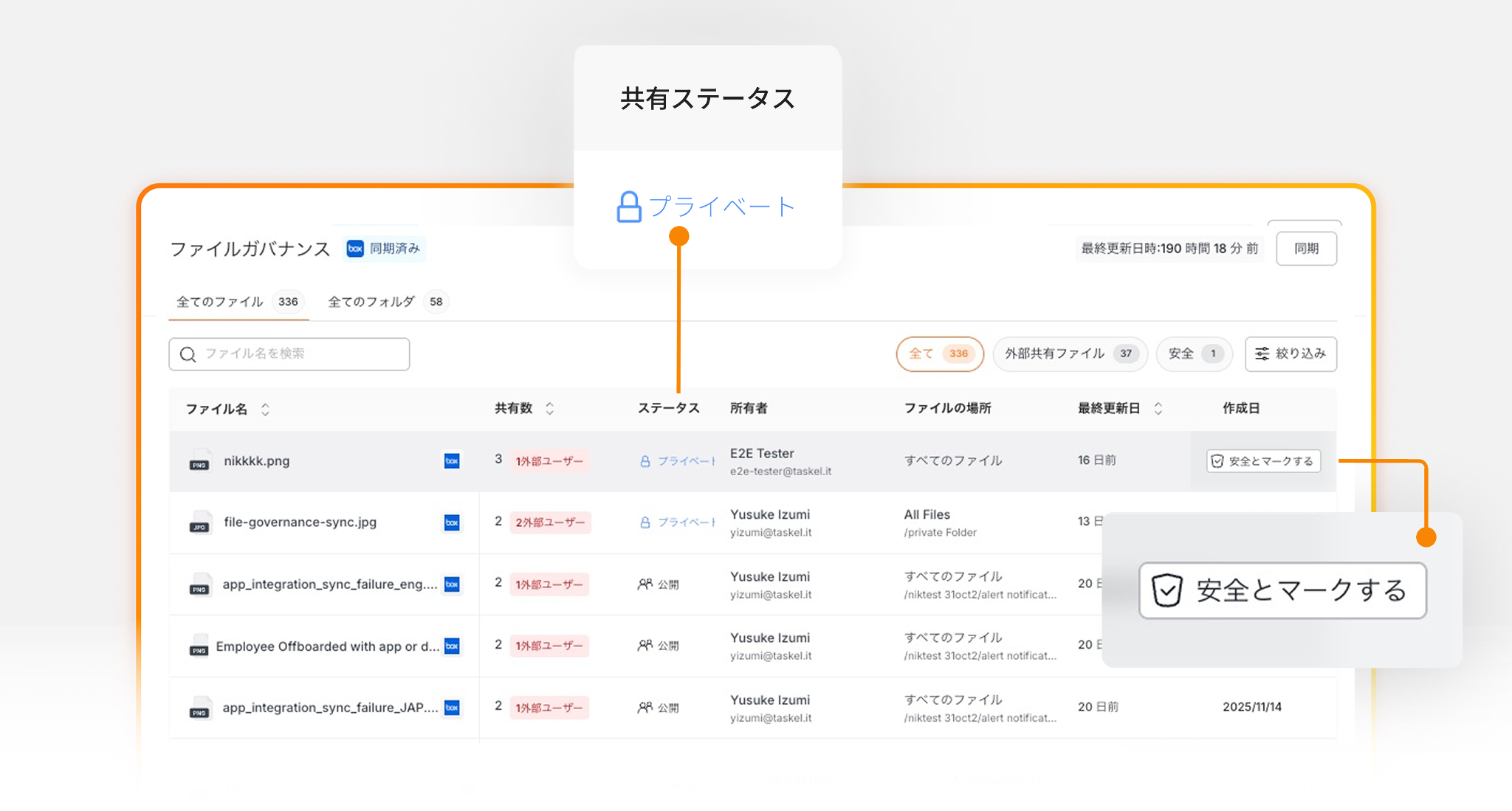 この機能により、外部共有されているファイルやフォルダを一元的に把握できます。「外部共有」または「無制限共有」でフィルタリングし、該当ファイルの詳細確認およびアクセス権限の削除をジョーシス上から実施できます。また、確認済みの項目は「安全」としてマークし、管理対象から除外できます。