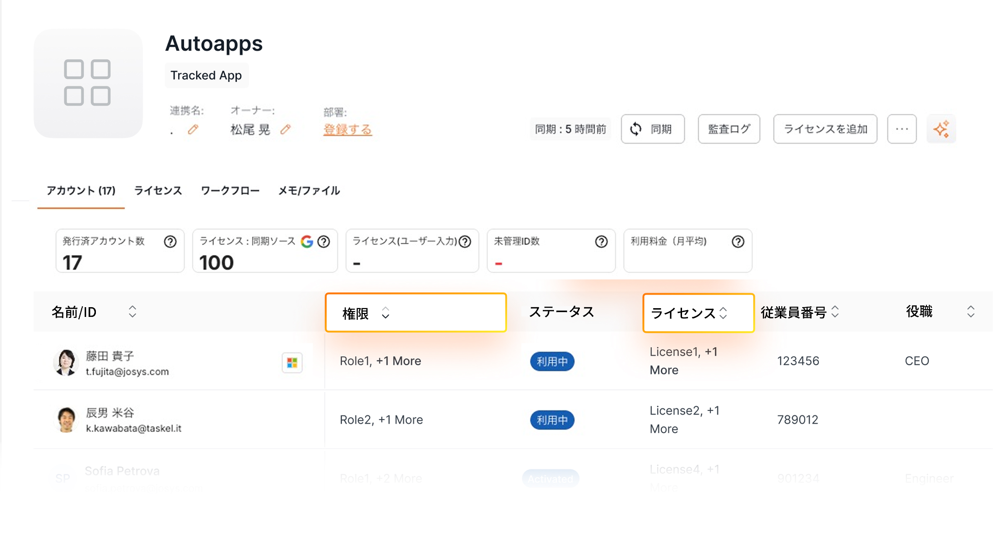 これまで連携アプリのみで提供していた、ユーザー権限、ライセンス、未管理ユーザの可視化が、非連携アプリでも利用できるようになりました。プラットフォーム上では「Tracked Apps」として表示されます。